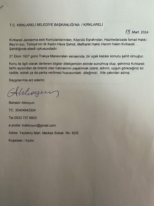 TÜRKİYE'NİN İLK KADIN UÇUŞ ŞEHİDİ MEFHARET HAKKI HANIM. ![]() TÜRKİYENİN İLK KADIN UÇUŞ ŞEHİDİ MEFHARET HAKKI HANIM. Mefharet Hakkı Hanım, Türkiye' nin ilk Kadın Uçuş Şehitidir. Babası KIRKLARELİ Vilayeti Jandarma Kumandanı Köprülü Eşrafından Hazinedarzade İsmail Hakkı Beydir. Trakya Manevraları Esnasında, 27 EKİM 1927 Tarihinde Junkers A-20 Uçağı ile, yolcu olarak uçtuğu esnada şehit olmuştur. MEFHARET HAKKI HANIM, Uçak kazasından kısa bir süre önce. (Fotoğraf Sn.Serdar Alay'dan alınmış ve izniyle yayınlanmıştır) ![]() Mefharet Hakkı Hanımın Kırklareli Şehitliğinde bulunan kabri. Fotoğraf: Bahadır Akkoyun ![]() Mefharet Hakkı Hanımın Kırklareli Şehitliğinde bulunan kabri. Fotoğraf: Bahadır Akkoyun Manevralar Esnasında, Hava Tatbikatı da yapılmış ve tatbikatın sonunda, izlemeye gelen sivil halktan da istekli olanlar uçurulmuştur. O yıllarda halka havacılığı sevdirmek çok önemliydi. Tüm il ve ilçelerde "Tayyare Cemiyetleri" kurulmuş ve yardım kampanyaları düzenlenerek ordumuza pek çok uçak satın alınarak hediye edilmiştir. Hemen hemen her il ve ilçe bir uçak alarak Hava Kuvvetlerimize hediye etmişti. Ordumuzun güçlendirilmesi amacıyla halk büyük bir özveri gösteriyordu. İşte bu amaçla düzenlenen ve öğleden sonra yapılan son uçuşta bu elim kaza meydana gelmiştir. Pilot Üsteğmen Asım Komutasındaki uçak, iniş esnasında kırım geçirmiş ve kaza sonucunda başını çarpan Mefharet Hanım, beyin kanaması sonucu çok genç yaşta hayatını kaybetmiştir. Kırklareli Şehitliğine defnedilmiş olup mezar taşında 1932 tarihi görülmektedir. Ancak Türk Havacılık Tarihi kayıtlarına göre kaza tarihi 27 Ekim 1927 olarak belirtilmektedir. ![]() JUNKERS A-20 Uçağı. Not: Görülen Uçak fotoğrafı başka bir Junkers A-20 uçağına ait olup www.tayyareci.com sitesinden alınmıştır. Aile, Mefharet Hakkı Hanımın kabri başında. Fotoğrafın çekildiği tarih 1933. Soldan ikinci, koyu renk giysili kız çocuğu, değerli arkadaşım Serdar Alay'ın annesidir. Fotoğraf kendisinin izni alınarak yayınlanmıştır. Fotoğrafta görüldüğü gibi o tarihte kabrin başındaki sütunun üzerinde Junkers A-20 Uçağının maketi ve bayrak varmış, bugün her nedense yerinde yok. Değerli arkadaşım Serdar Alay'ın dedesi, Kırklareli Jandarma Kumandanı İsmail Hakkı Bey. Fotoğraf, Serdar Alay'dan alınmış ve izniyle yayınlanmıştır. Değerli Arkadaşım Serdar Alay, Kırklareli Şehitlik ziyaretinde. Sitemize değerli katkıları nedeniyle çok teşekkür ederiz. Mefharet Hakkı Hanımın hatırasını yaşatmak amacıyla, isminin bir cadde, sokak veya parka verilmesi için, Kırklareli Belediye Başkanlığı'na, aile bireyleri adına yaptığımız müracaat maalesef kabul edilmemiştir. ilgili başvurumuzu içeren belge aşağıda görülmektedir. ![]() KIRKLARELİ BELEDİYE BAŞKANLIĞI'NIN DİLEKÇEMİZE VERDİĞİ RET CEVABI DA AŞAĞIDA GÖRÜLMEKTEDİR. YORUM SİZLERİN. BAHADIR AKKOYUN ![]() www.pikovamubadilleri.com |
